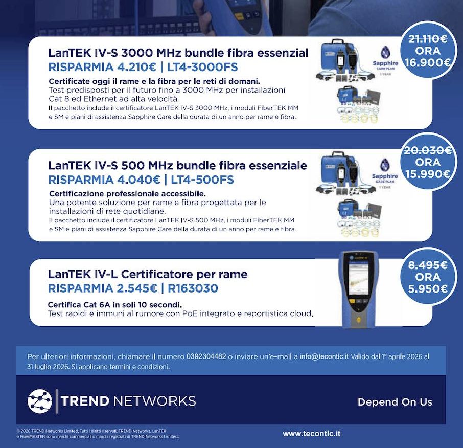 Approfitta della promo primavera e accedi a strumenti professionali ad alte prestazioni, progettati per supportare installazioni di ultima generazione e garantire test rapidi, affidabili e conformi agli standard più evoluti. Bundle completi con moduli fibra e assistenza inclusa per assicurare continuità operativa, efficienza e qualità nelle infrastrutture di rete.